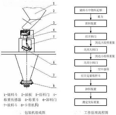 該顆粒包裝機由機架、給料器、稱料斗和電氣箱四部分組成。在對塑料顆粒、糧食、種子、炒貨、飼料等顆粒包裝工作開始時,本顆粒定量包裝機兩臺給料器同時對稱料斗喂料,喂料過程由控制儀表通過對傳感器輸出信號連續(xù)采樣,并隨時與大投值比較,當料重不小于大投值時,自動停止大投給料器,剩下一臺小投給料器繼續(xù)細喂料,并與目標值比較,當料重接近目標值時(稱重值=目標值-落差值),停止喂料,等待操作者套袋,有套袋操作時,感應開關(guān)向儀表送出開關(guān)信號,塑料顆粒包裝機卸料,無套袋操作時機器等待,直至套袋卸料。